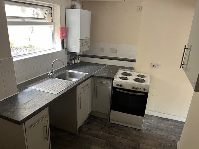 Fitted kitchen, window to rear, gas central heating boiler, door to;